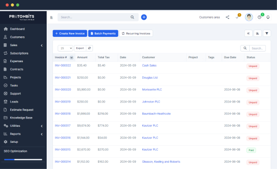 Effortlessly craft professional invoices with a single click. Seamlessly attach files and dispatch them directly to your clients, complete with a PDF version of the invoice. Customize taxes based on item types. Establish recurring invoices that regenerate automatically according to your preset schedule, ranging from monthly to yearly intervals.